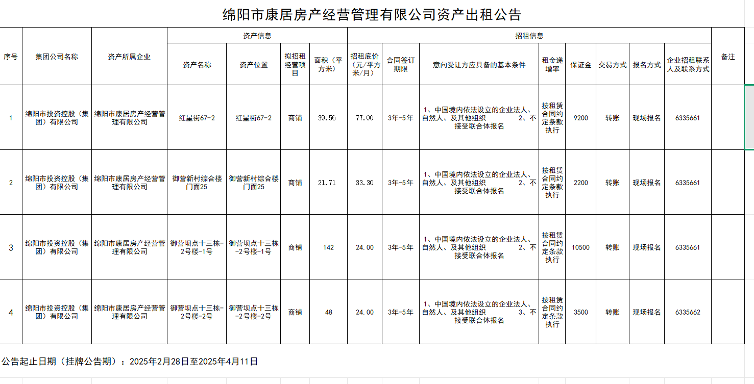 綿陽市康居房產(chǎn)經(jīng)營管理有限公司資產(chǎn)出租公告