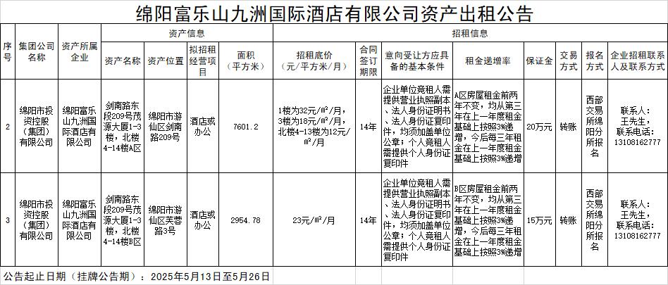 綿陽富樂山九洲國際酒店有限公司資產(chǎn)出租公告