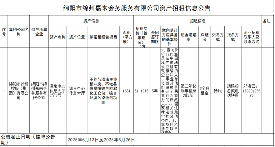 綿陽市綿州嘉來會務服務有限公司資產(chǎn)招租信息公告