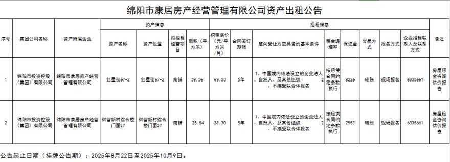 綿陽(yáng)市康居房產(chǎn)經(jīng)營(yíng)管理有限公司資產(chǎn)出租公告