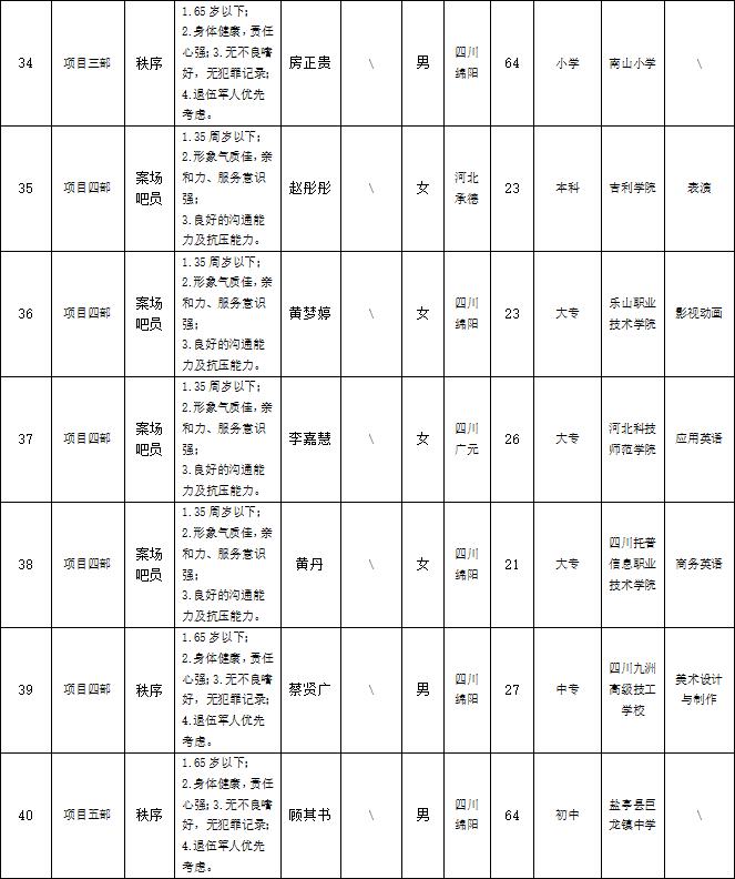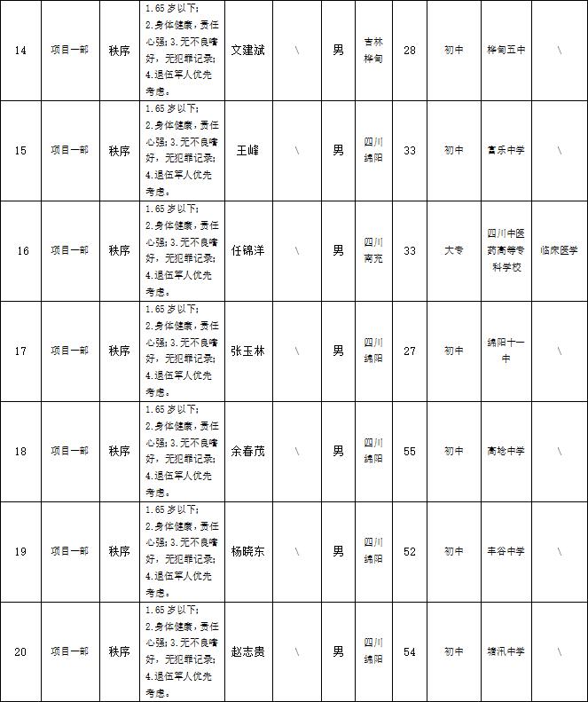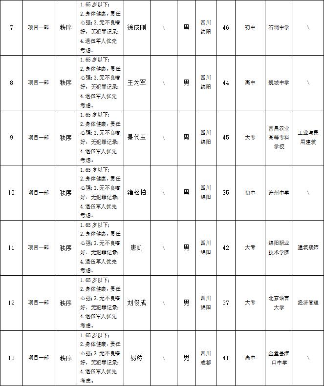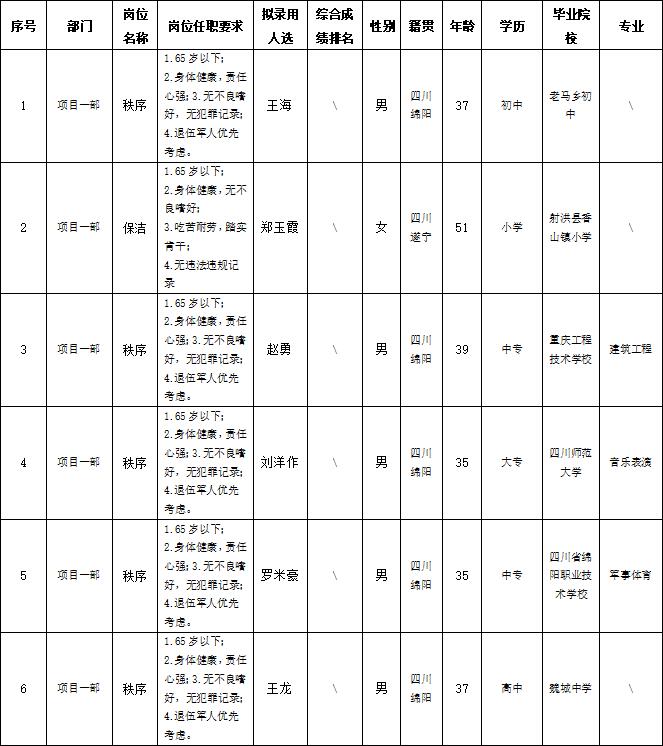 根據(jù)綿陽市康來物業(yè)服務(wù)有限公司發(fā)布的招聘公告及招聘相關(guān)規(guī)定,經(jīng)面試等程序,擬錄用以下人員到各項(xiàng)目部工作,現(xiàn)予以公示,具體情況如下: