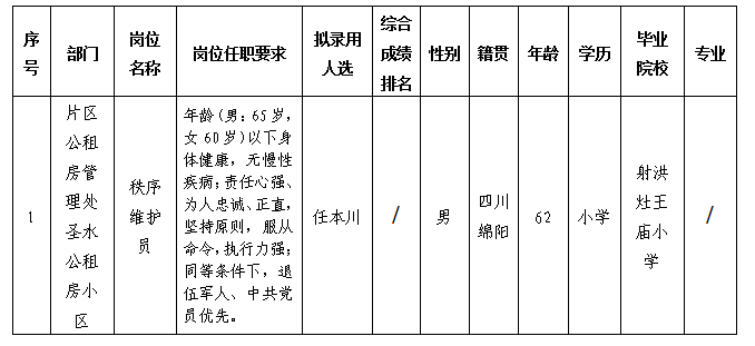 根據(jù)康居公司發(fā)布的長(zhǎng)期招聘一線勤雜人員的招聘公告相關(guān)規(guī)定,經(jīng)面試、體檢等程序,擬錄用任本川同志到綿陽市康居房產(chǎn)經(jīng)營(yíng)管理有限公司片區(qū)公租房管理處圣水公租房小區(qū)工作,現(xiàn)予以公示,具體情況如下: