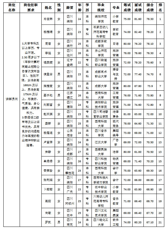 根據(jù)四川越王樓文化傳播有限公司發(fā)布的招聘公告及招聘相關規(guī)定,經(jīng)筆試、面試等程序,現(xiàn)將筆試(面試)成績予以公示。