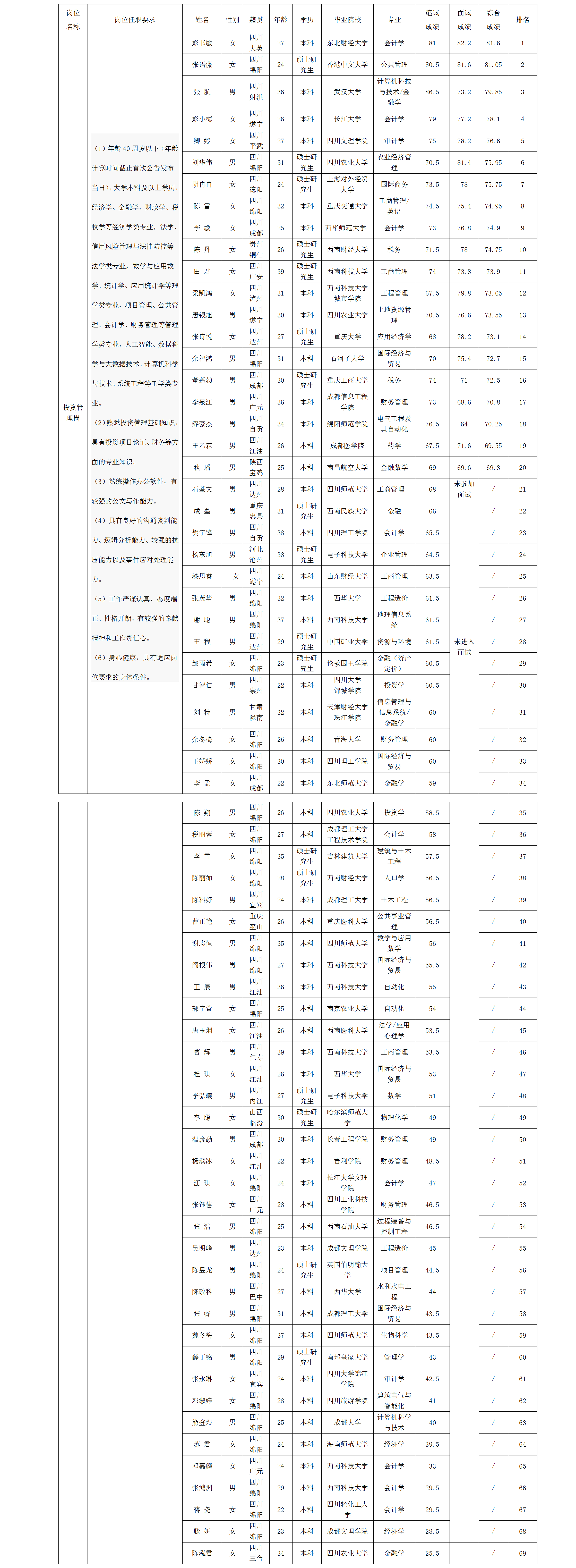 根據(jù)綿陽市投資控股(集團)有限公司發(fā)布的招聘公告及招聘相關(guān)規(guī)定,經(jīng)筆試、面試等程序,現(xiàn)將筆試(面試)成績予以公示。