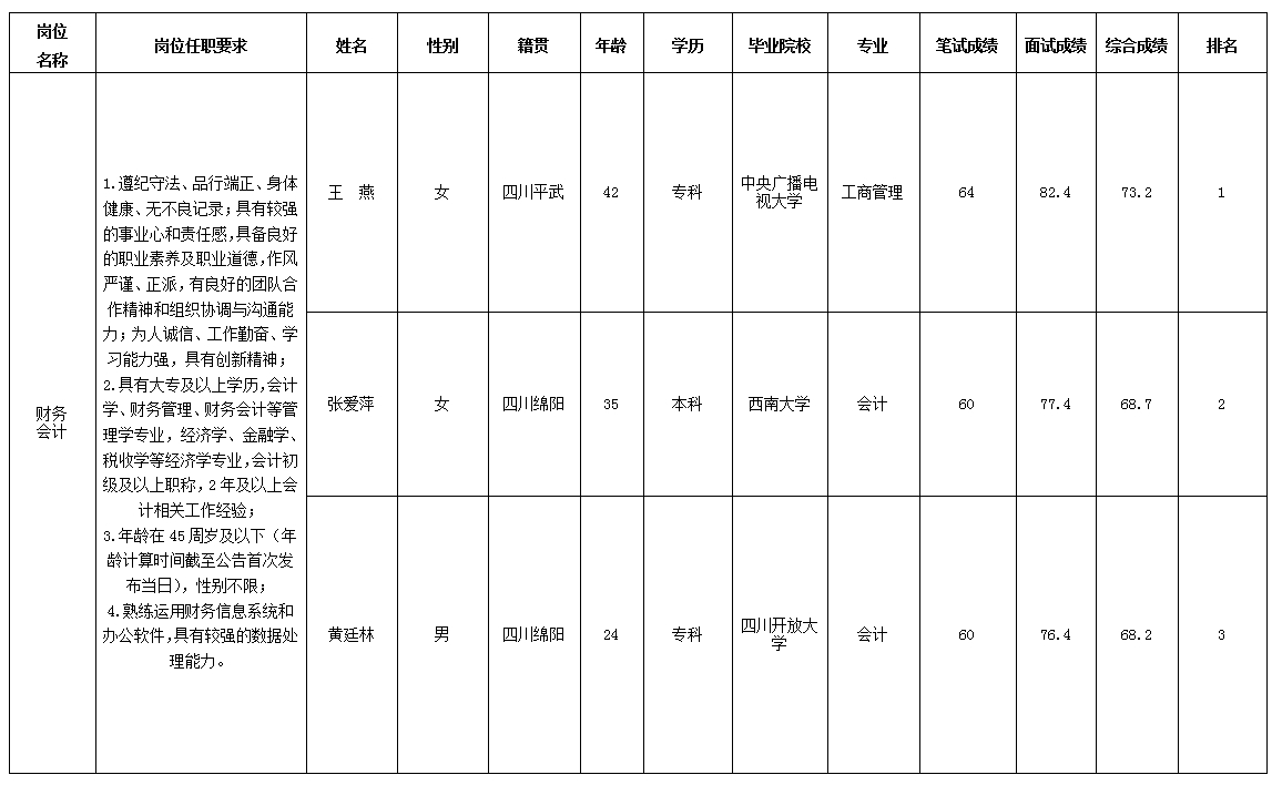 根據(jù)綿陽(yáng)市綿州嘉來(lái)會(huì)務(wù)服務(wù)有限公司發(fā)布的招聘公告及招聘相關(guān)規(guī)定,經(jīng)筆試、面試等程序,現(xiàn)將筆試(面試)成績(jī)予以公示。