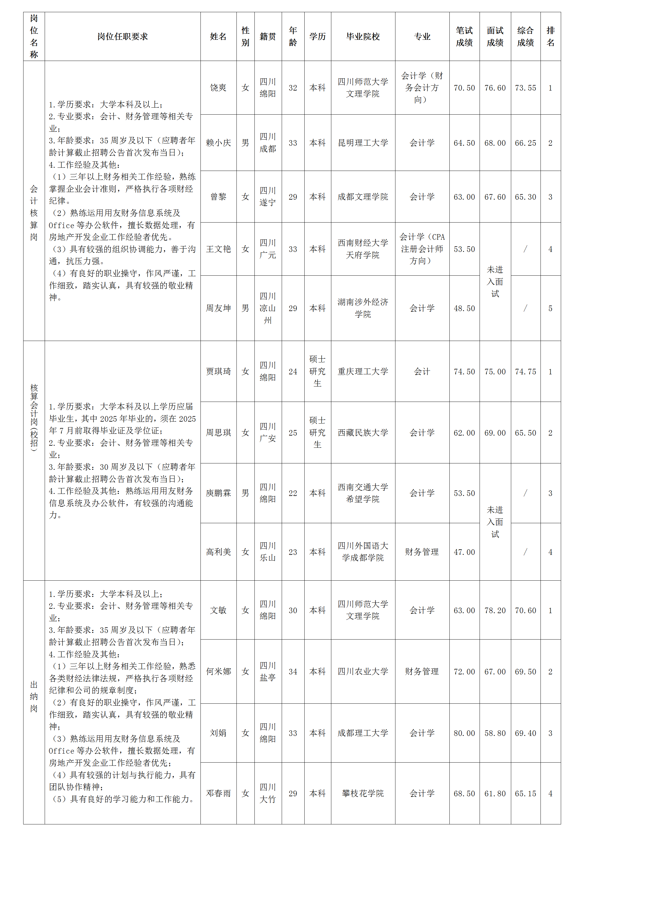 【公開招聘】綿陽市綿投置地有限公司關(guān)于會計核算崗等崗位測試成績的公示