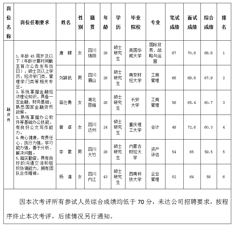 根據(jù)綿陽金控投資管理有限責任公司發(fā)布的招聘公告及招聘相關(guān)規(guī)定,經(jīng)筆試、面試等程序,現(xiàn)將筆試(面試)成績予以公示。