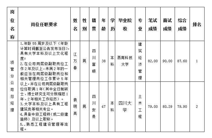 根據四川嘉來建筑工程有限公司發(fā)布的延長項目管理分公司總經理崗位報名時間的公告及相關規(guī)定,經筆試、面試等程序,現將綜合成績予以公示。
